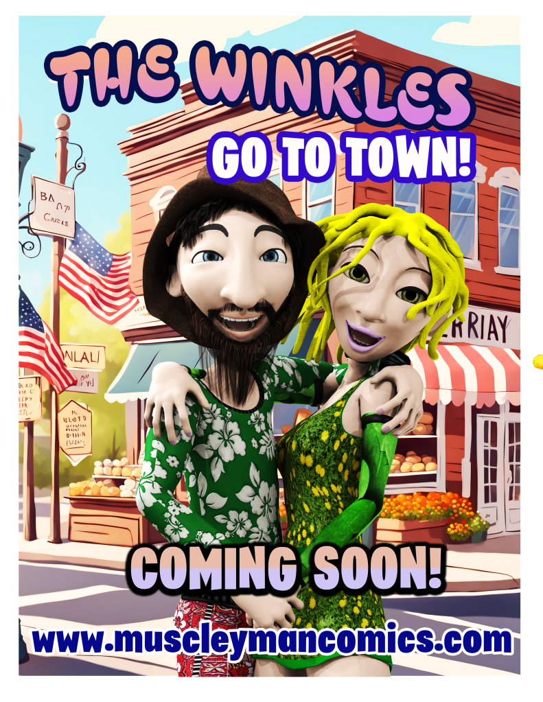 Right now the only items for sale is the current Comic Book – The Winkles Meet the Neighbors, and assorted t-shirts and stickers I’m working on to get into the tshirt shop. I don’t have much else available in the world of comics. But a red muscly superhero, Crimson Fox will make his debut in the store as well as Shorts of MuscleyMan Comics in book format will as well. All new never before seem content and all Safe for the Whole Family.